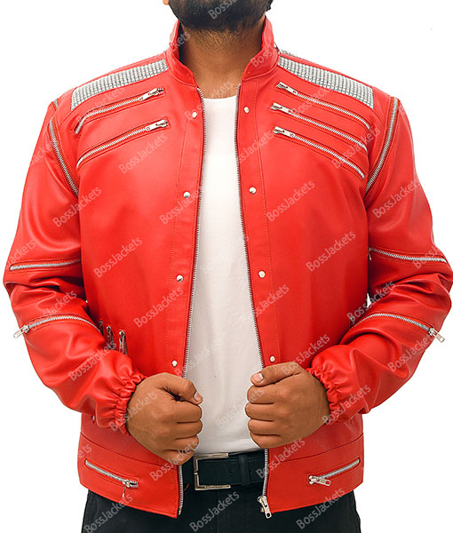 Generously cut from superior quality PU leather, the Michael Jackson Beat It red jacket radiates premium stitching. Not compromising on comfort, style or quality, the soft inner viscose lining ensures added comfort, warmth and durability. Including every single minute detail from this retro MJ classic look, the Beat It jacket has the evergreen stand up collar, studded epaulets and full zipper front closure. Simple yet artistic, the multi zippered detailing on the front and back pockets is a fashion statement on its own.