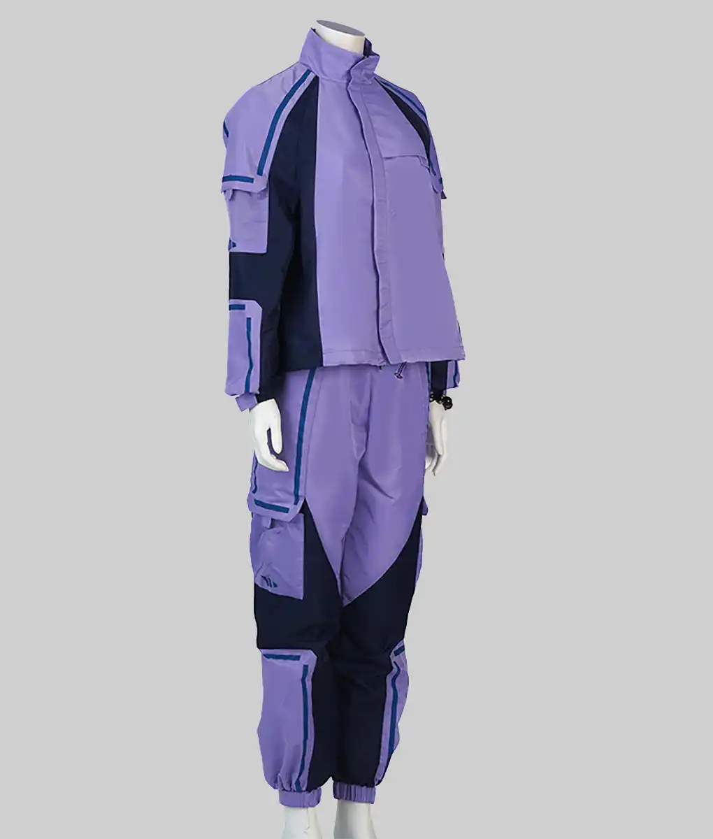 Letitia Wright’s Shuri transformed from playful tech genius to leader carrying her nation’s future in Black Panther: Wakanda Forever. Her journey through grief and responsibility showcased strength forged through loss and innovation born from necessity. This Shuri purple tracksuit represents that evolution through Wakandan design principles, meeting functional athletic wear.